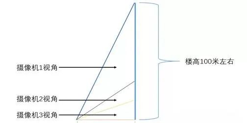 对于一个楼高在100米左右的大楼来说,可以通过3个相机进行覆盖,一个摄像机照0—15米的高度,一个摄像机照15-30米的高度,一个摄像机覆盖30-100米的高度: